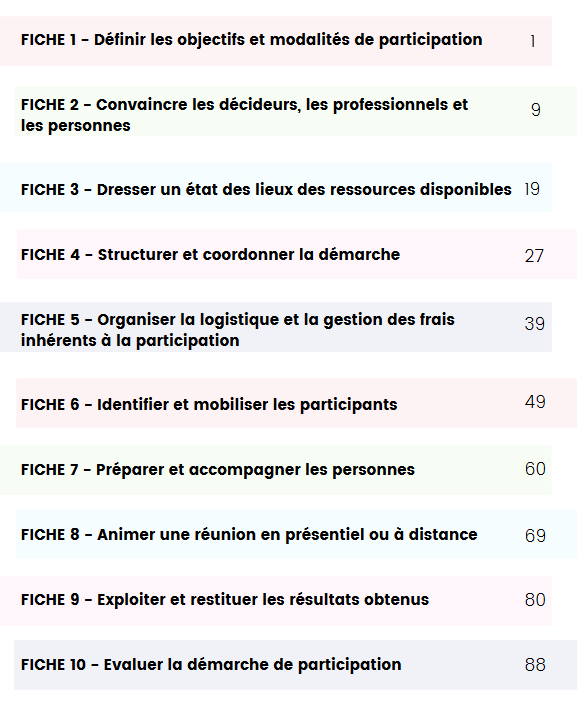 "un kit de 10 fiches pratiques pour mobiliser et accompagner la participation des personnes en situation de fragilités. Cet outil apporte des clés théoriques et des éléments pratiques pour concevoir et améliorer les actions de participation qui associent des personnes en situation de précarité. " (site internet de l'ANSA).